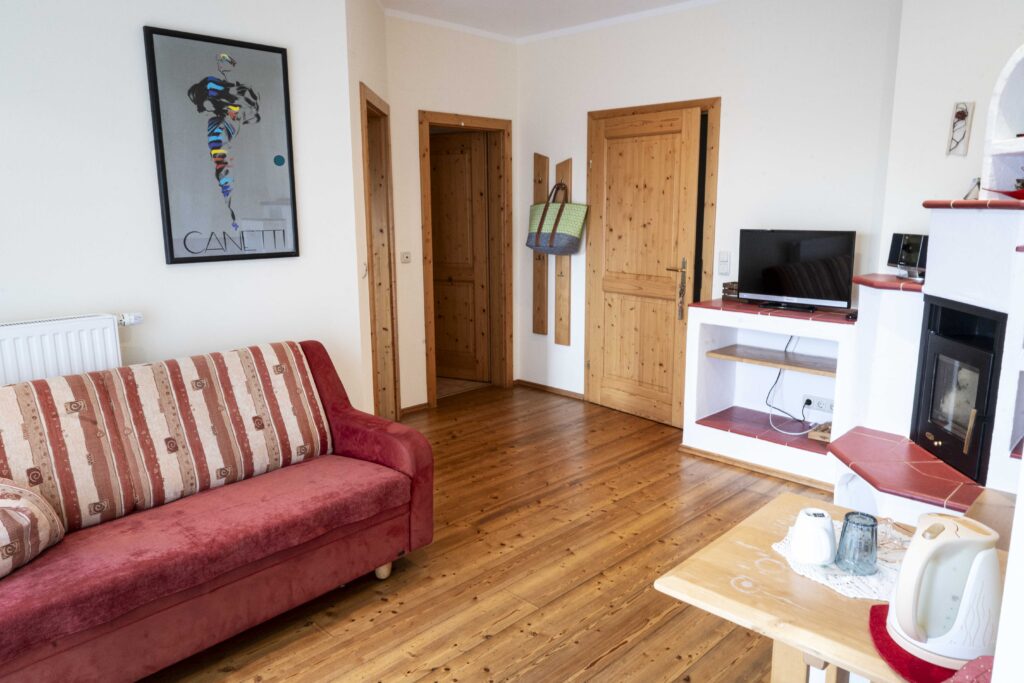 Die Rosensuite ist unser schönstes Zuhause auf Zeit. Du wohnst in einem großzügigen Wohnraum mit eigenem Kachelofen und ausziehbarer Couch sowie in einem zusätzlichen Schlafraum. Im Bad erwartet dich eine idyllische Eckbadewanne, die Toilette ist getrennt. Auf 36 m² findest du viel Raum zum Entspannen und Ankommen.